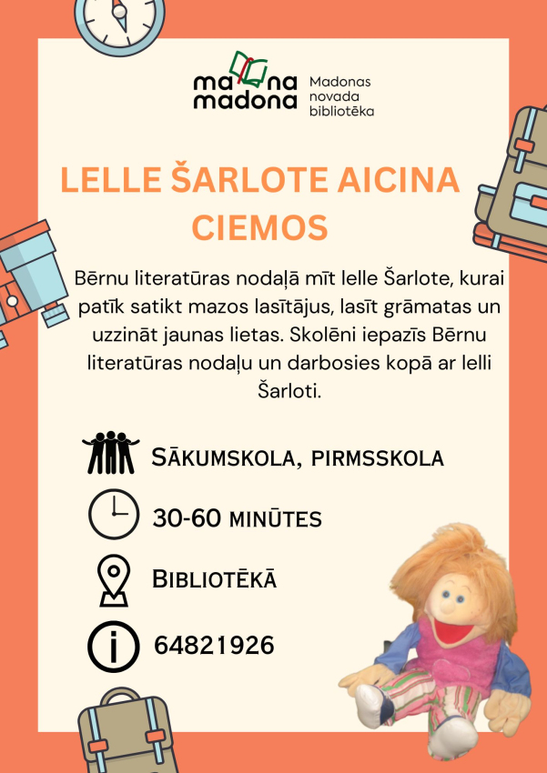 Bērnu literatūras nodaļā mīt lelle Šarlote, kurai patīk satikt mazos lasītājus, lasīt grāmatas un uzzināt jaunas lietas. Bērni iepazīs Bērnu literatūras nodaļu un darbosies kopā ar lelli Šarloti.