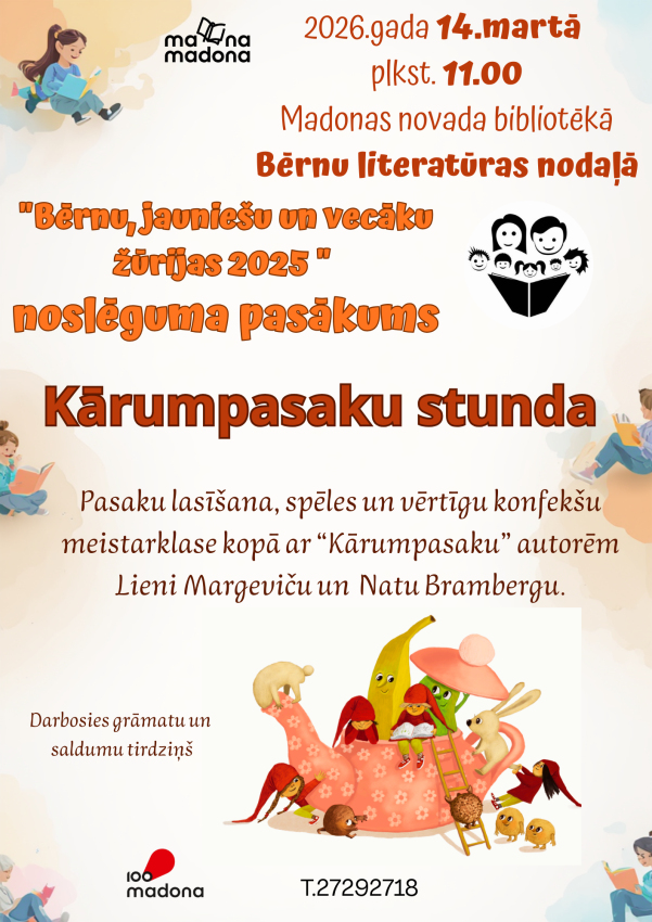 Madonas novada bibliotēkas Bērnu literatūras nodaļa 14.martā plkst.11.00 aicina uz lasīšanas veicināšanas programmas "Bērnu, jauniešu un vecāku žūrijas" noslēguma pasākumu. Tā īpašie viesi būs grāmatas "Kārumpasakas un vērtīgu konfekšu receptes " autores Liene Margeviča un Nata Bramberga. Pasākuma laikā lasīsim pasakas, spēlēsim spēles, gatavosim veselīgas konfektes. Ar grāmatas ilustratori Marinu Heniņu būs radoša un mākslinieciska darbošanās.