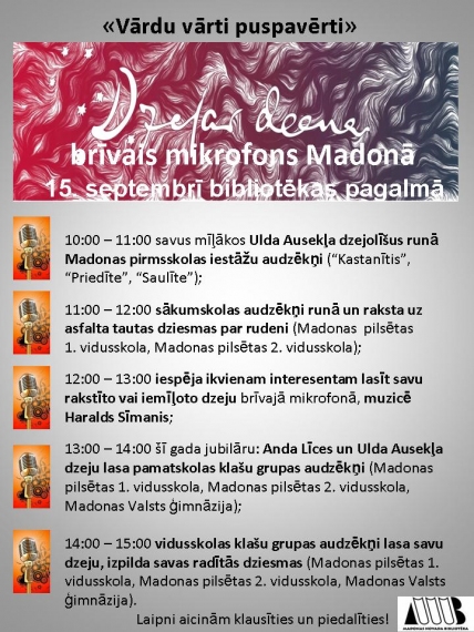 «Vārdu vārti puspavērti» - Dzejas diena - brīvais mikrofons Madonā 15. septembrī Madonas novada bibliotēkas pagalmā: