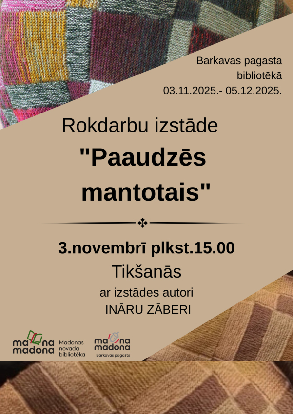 3.novembrī plkst.15.00 izstādes atklāšana un tikšanās ar rokdarbnieci Ināru Zāberi. Aicināti interesenti!