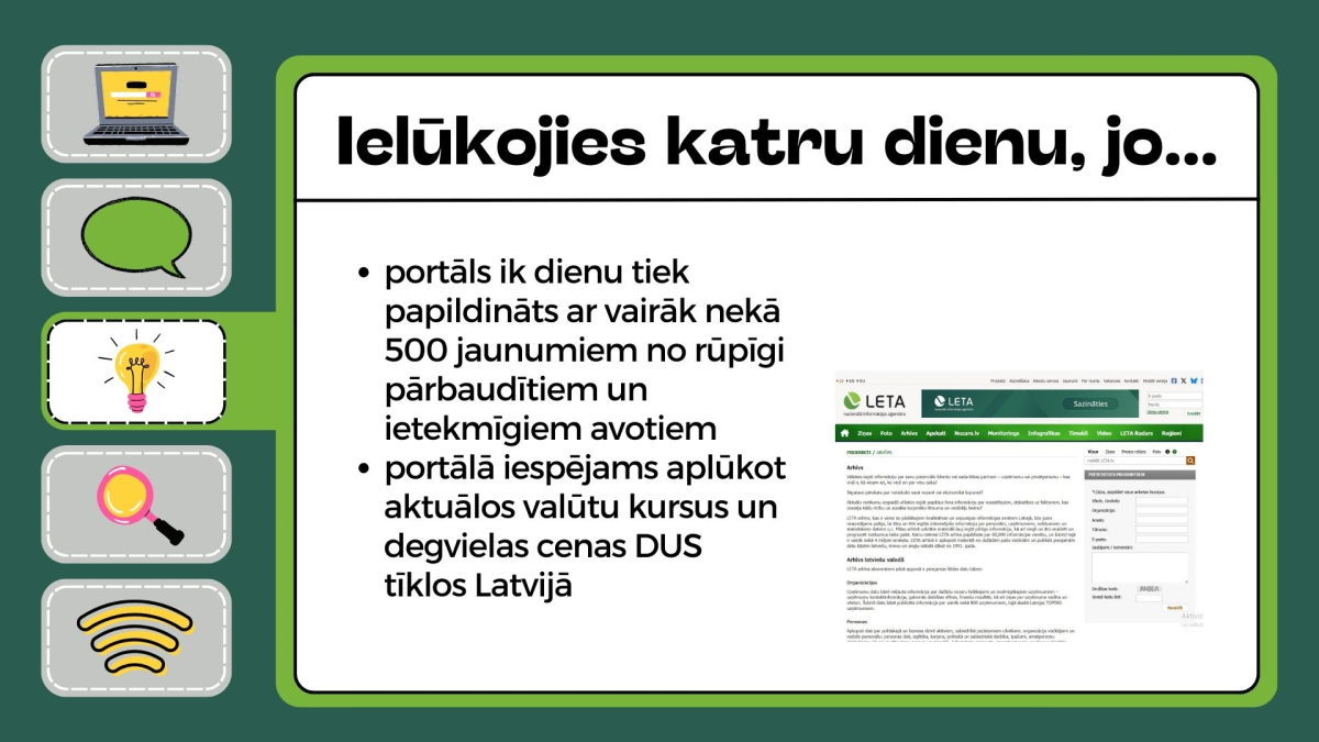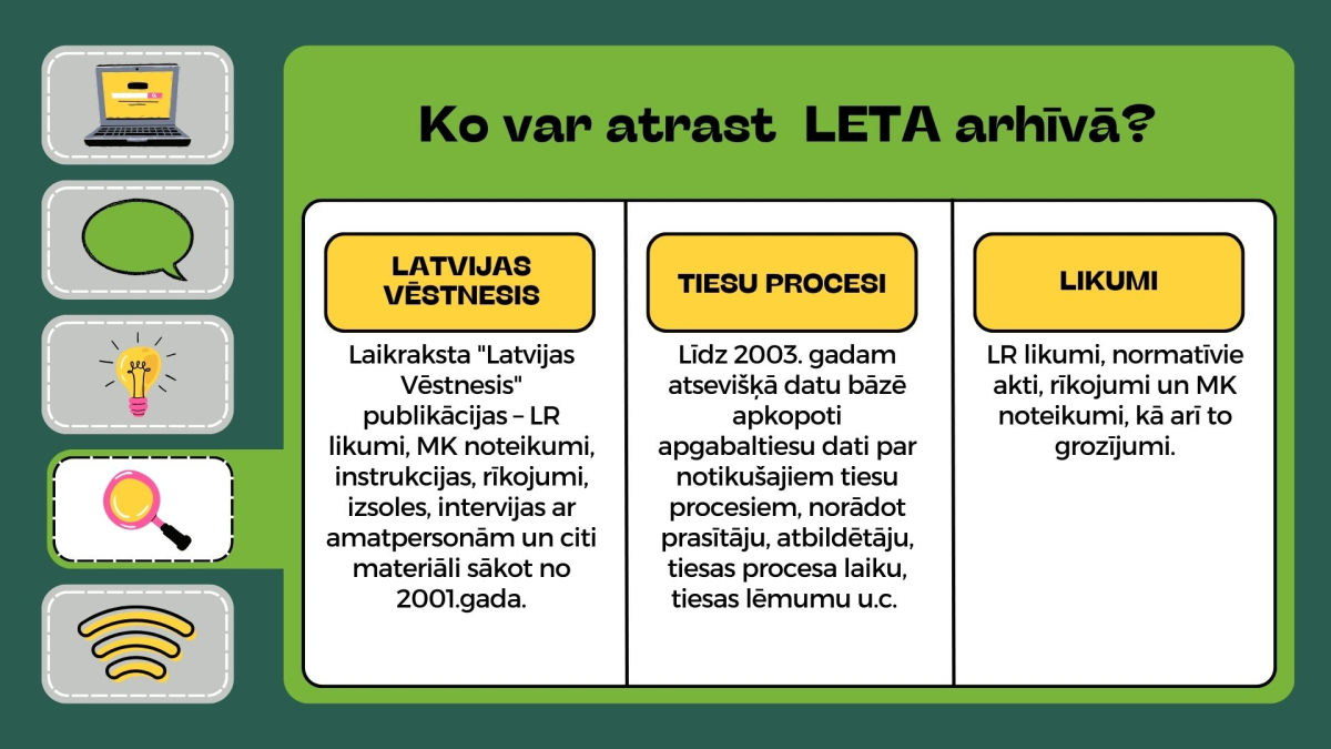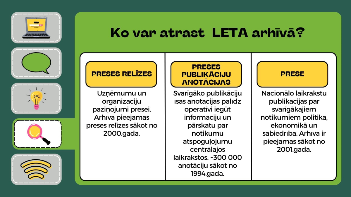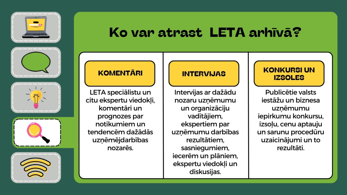 LETA arhīvā ir apkopoti materiāli no dažādām pašu veidotām un publiski pieejamām datu bāzēm latviešu, krievu un angļu valodā sākot no 1991. gada.