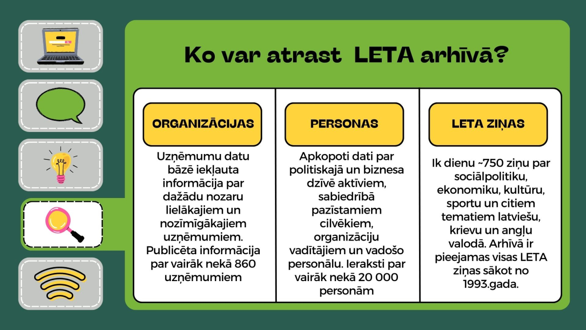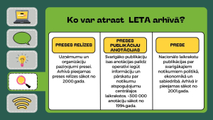 LETA arhīvā uzkrātie materiāli ļauj iegūt pilnīgu informāciju, kā arī viegli un ātri analizēt un prognozēt notikumus laika gaitā.