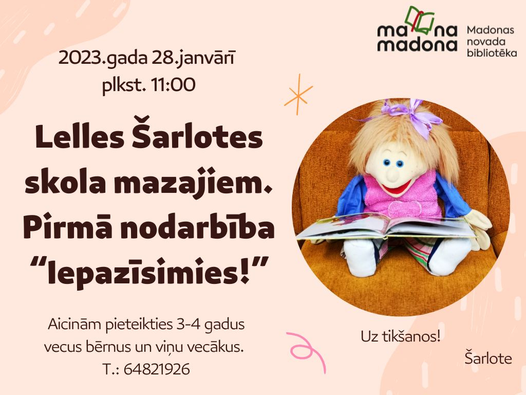 2023.gada 28.janvārī plkst. 11:00 uz pirmo lelles Šarlotes skolas mazajiem nodarbību “Iepazīsimies!” Madonas novada bibliotēkas Bērnu literatūras nodaļā aicinām 3 - 4 gadus vecus bērnus un viņu vecākus.
