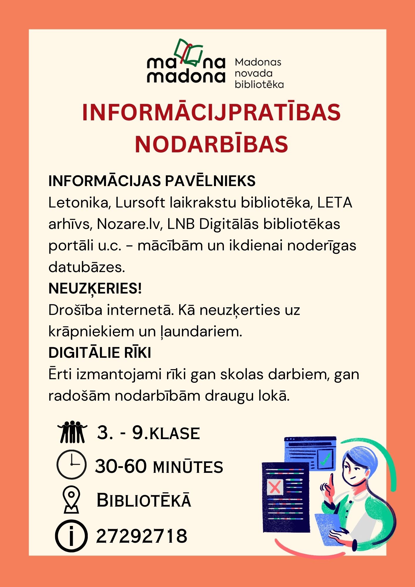 individuālas un kolektīvas konsultācijas par bibliotēkas piedāvājumu, pieejamām datu bāzēm, informācijas meklēšanu (kā atrast, atlasīt un novērtēt pieejamo informāciju) u.c. tematiem pēc pieprasījuma.